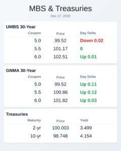WTMS Blog Today = What's up in Mortgage Today (PM) - 12/17/2025 Mortgage bonds are testing investor patience as the 30-year UMBS 5.0 coupon dropped to 99.47, down 7 basis points from yesterday's close. The [...]