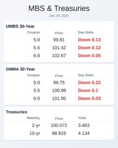 WTMS Blog Today = What's up in Mortgage Today (AM) - 12/30/2025 Bond markets enter peak holiday mode as we approach the final trading day of 2025. MBS prices declined modestly overnight with 30-year UMBS 5.0 coupon down 9 basis points to 99.85. The 10-year Treasury yield climbed to 4.14%, up 29 basis points from yesterday's close. Volatility becomes more unpredictable during these holiday periods despite historically sideways movement patterns. Trading volumes remain light as many market participants continue year-end vacations. The lack of significant news flow means sudden movements can occur without apparent catalysts, making pricing decisions more challenging for originators. October housing data provided mixed signals for the mortgage market. Case-Shiller home prices rose 1.3% year-over-year, slightly above the 1.1% forecast. FHFA home price index gained 0.4% monthly, beating expectations of 0.1%, while Chicago PMI improved to 43.5 from 36.3 previously. J.P. Morgan is bringing $587.6 million of non-QM mortgage exposure to market through their 2025-NQM5 securitization. The deal includes 1,611 first-lien loans with 44.5% designated non-QM, showing continued investor appetite for alternative mortgage products. Nearly 73% of borrowers maintain FICO scores above 720, demonstrating solid credit quality despite non-traditional documentation. President Trump hinted at having a preferred candidate for Fed Chair but remains in no hurry to announce. He also suggested he might fire Jerome Powell, adding political uncertainty to an already volatile rate environment. These comments could influence bond market sentiment as we enter 2026. Locking vs Floating Bond markets are entering peak holiday trading mode with wider movement ranges possible for no apparent reason. The next risk for consequential volatility won't arrive until the first week of January. MBS prices dropped an eighth with 10-year yields up 2.7 basis points at 4.135 this morning, suggesting modest weakness overnight. Today's Events - Case Shiller Home Prices-20 y/y (Oct): 1.3% vs 1.1% forecast, 1.4% previous - FHFA Home Price Index m/m (Oct): 0.4% vs 0.1% forecast, 0% previous - Chicago PMI (Dec): 43.5 vs 39.5 forecast, 36.3 previous - FOMC Minutes from December meeting at 2:00 PM Bond Pricing UMBS 30 yr | Coupon | Price | Intra-Day Change | | 5.0 | 99.81 | -0.13 | | 5.5 | 101.42 | -0.12 | | 6.0 | 102.67 | -0.05 | GNMA 30 yr | Coupon | Price | Intra-Day Change | | 5.0 | 99.75 | -0.22 | | 5.5 | 100.99 | -0.1 | | 6.0 | 101.95 | -0.03 | Treasuries | Term | Yield | Price | Intra-Day Yield Change | | 2 yr | 3.463 | 100.072 | 0.006 | | 3 yr | 3.517 | 99.952 | 0.013 | | 5 yr | 3.688 | 99.713 | 0.019 | | 7 yr | 3.902 | 99.077 | 0.024 | | 10 yr | 4.134 | 98.915 | 0.023 | | 30 yr | 4.819 | 96.938 | 0.023 |